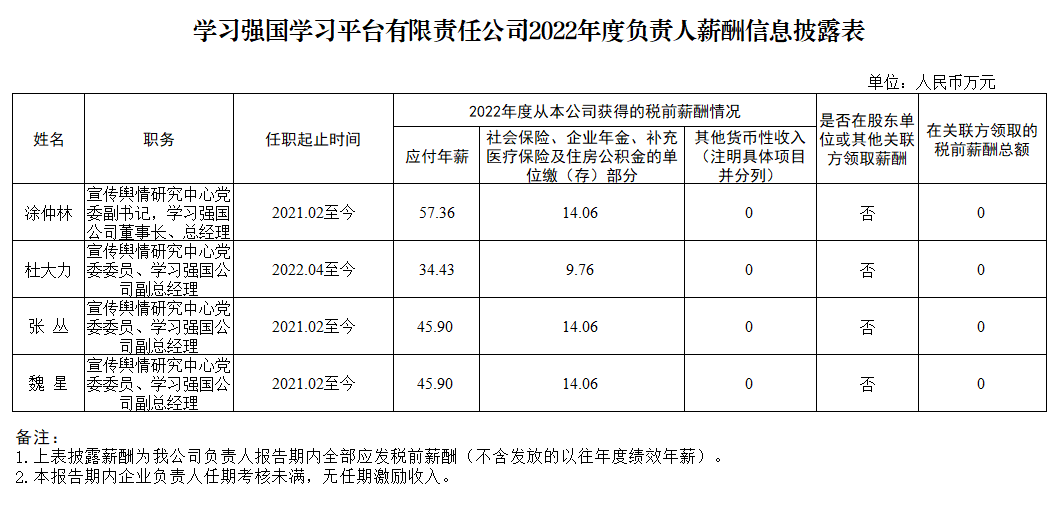 学习强国学习平台有限责任公司2022年度负责人薪酬信息披露表-中国文明网