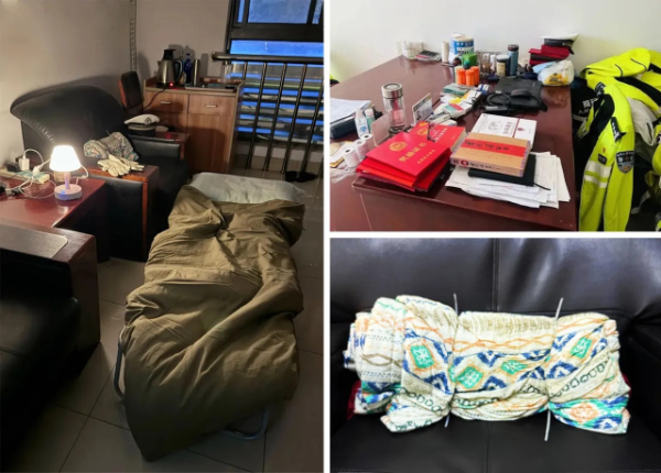 许允若的办公室凌乱得有点过分,桌上满是书籍材料纸张,还有一摞摞病历和医院配的药。椅背上挂满了制服,一层一层,看得出这些衣服陪着许允若走过的春夏秋冬。桌边的开水壶里还熬着中药,灯亮着。一张行军床就放在办公室,一盏声控小台灯放在茶几上。茶几边的硬木沙发上,一个折叠成小方块的床单用塑料束带绑着,这是许允若自制的靠垫,据说这个靠垫能让他坐着时稍微舒服点,他有很严重的腰椎间盘突出症。