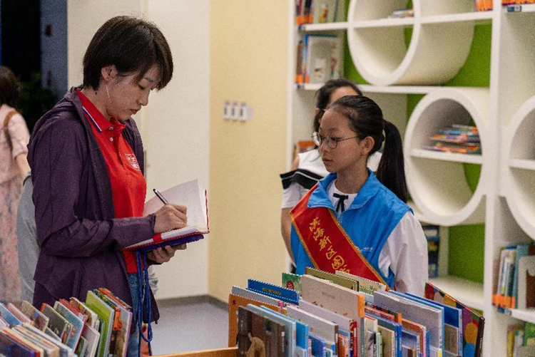 9月24日,小志愿者正在图书馆里进行志愿服务,帮助图书管理员整理书架、摆放书籍。新华网 钟奕 摄