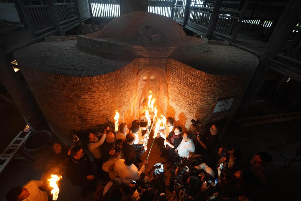 2023年10月19日,嘉宾与把桩师傅一起对葫芦窑进行复烧点火。当日,作为2023中国景德镇国际陶瓷博览会的活动之一,景德镇古窑民俗博览区对重建的明代葫芦窑进行点火复烧。同时,景德镇历代瓷窑活态传承纪实馆开馆。新华社记者 周密 摄