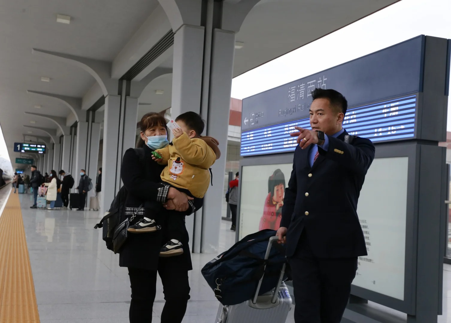 铁路工作人员帮助旅客进站乘车。
