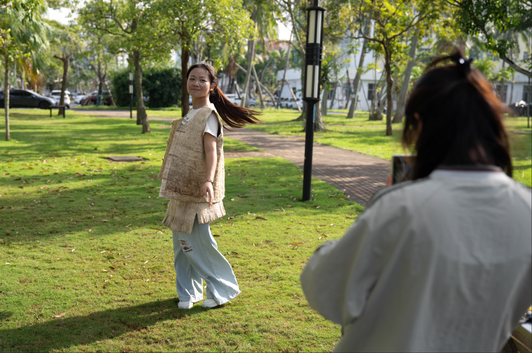 王熙现场讲解了“树皮成衣”的工艺过程。她指出,黎族树皮布的制造历史源远流长,它见证了人类衣物从无纺到有纺的演变历程,该技艺主要分布于海南中南部黎族聚居区。同学们在老师指导下亲手触摸树皮质感,试穿体验,感受这项古老技艺所承载的民族智慧与适应自然的力量。