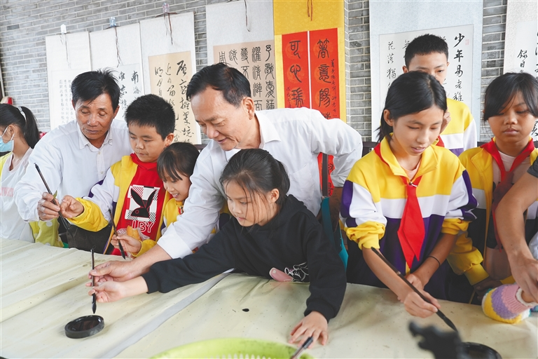在万宁市后安镇曲冲村,万宁书法协会成员教孩子们写毛笔字。后安镇政府供图