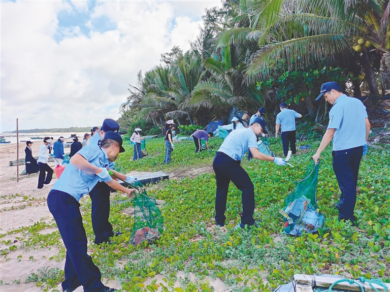 海南省公安厅反走私和海岸管理总队第二支队民警在东郊椰林开展海岸净滩活动。受访者供图