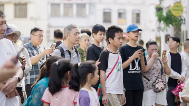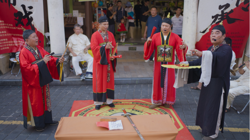 观展结束后,一场原汁原味的平安斋文戏表演在骑楼老街艺术馆精彩上演。四位表演者嗓音清越,仪态端庄,通过细腻的唱腔和丰富的科仪动作,将蕴含其中的古老故事与祈福愿景娓娓道来。演出中,七位乐师组成的乐队以鼓、锣、唢呐等传统乐器进行伴奏,古朴悠扬的乐声在老街回荡,瞬间将观众带入到神圣而庄严的艺术境界之中。精彩的演出不仅吸引了大量市民游客驻足围观,更引得不少外国友人纷纷举起相机记录。在第二场表演中,海南斋戏传承人王治庆独立表演了平安斋武戏,其动作刚劲有力,节奏鲜明,与之前的文戏形成鲜明对比,充分展现了斋戏艺术“文武兼备”的丰富内涵,再次引来围观群众的阵阵喝彩。