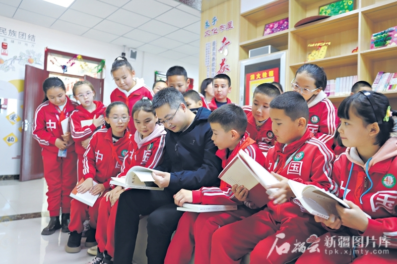 2024年10月20日,在木垒哈萨克自治县新户镇中心学校刚刚投运的文化长廊中,该校小讲解员正向同学们介绍学习心得,他们用真挚的情感、生动的语言阐述对中华优秀传统文化的感悟。课间,福建南平援疆干部与学生们坐在长廊的书屋中诵读、学习经典作品。