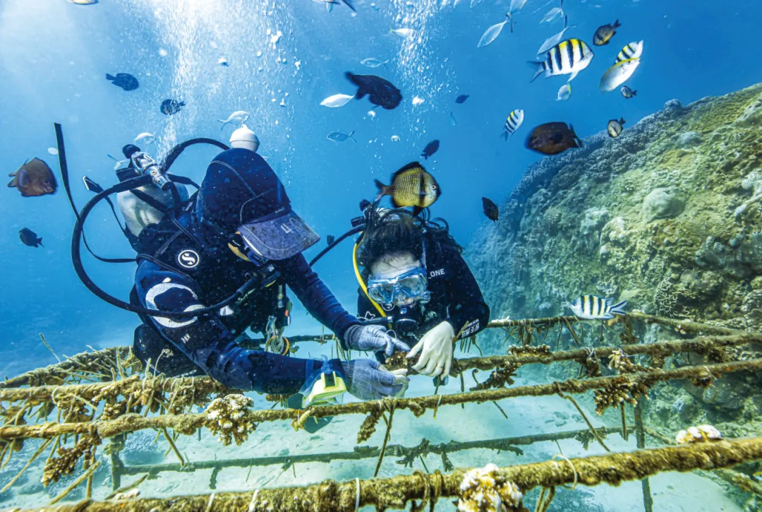游客在三亚大东海滨海水运动乐园体验潜水种珊瑚,助力海洋生态修复