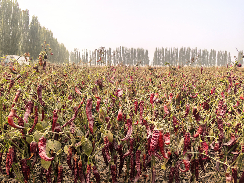 一师八团的辣椒地里,火红的辣椒挂满枝头。
